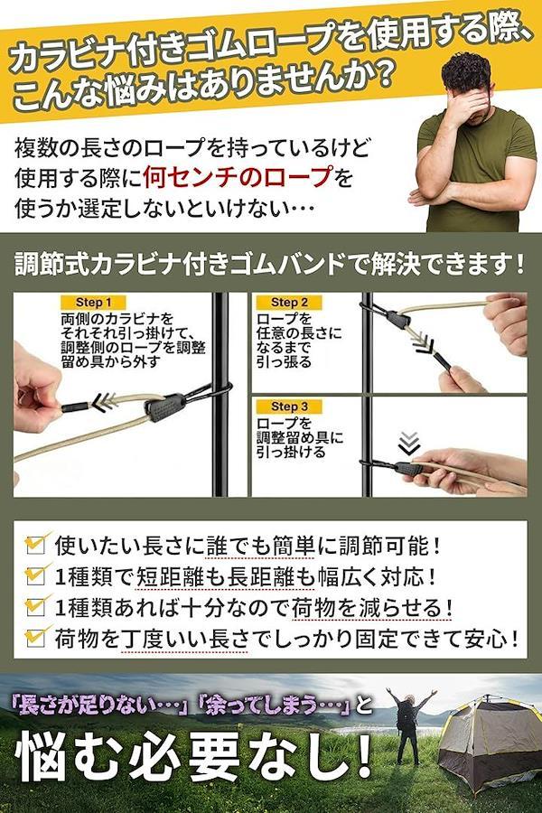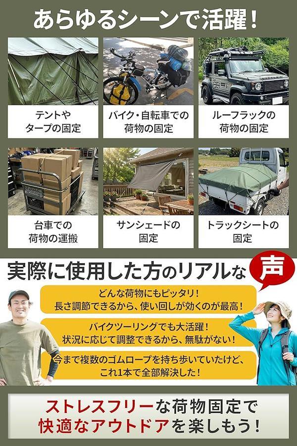 「キャンプ・アウトドア・車・バイク・DIYに最適」 テントやタープの固定、車・トラックの荷物整理、車のルーフラックやバイクの荷物固定など、幅広い用途に対応。