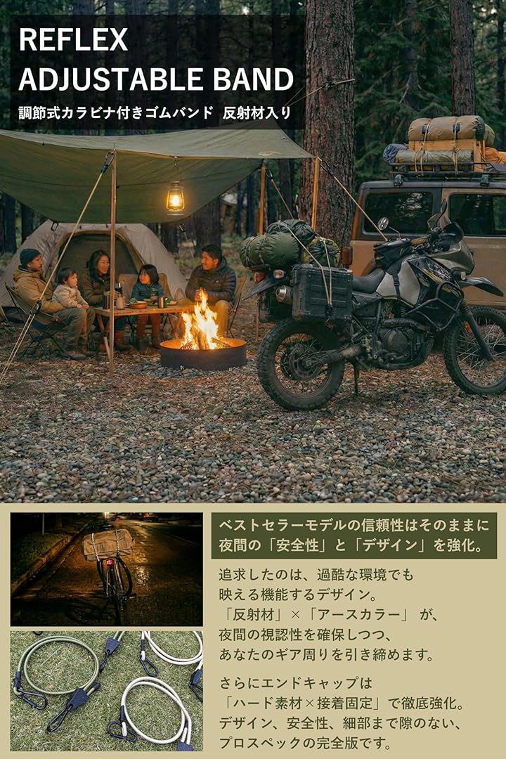 長さ調節 x 反射材 x アースカラー」 キャンプの設営やバイクの積載で、こんな経験はありませんか? 「持ってきたゴム紐が長すぎて緩い、または短すぎて届かない…」 「夜、荷台の荷物が後続車から見えているか不安…」 「カッコいいテントなのに、ゴムバンドだけ色が浮いている…」 そんなアウトドアファンの悩みを解決するために生まれたのが、この調節式・反射材入りバンジーコードです。