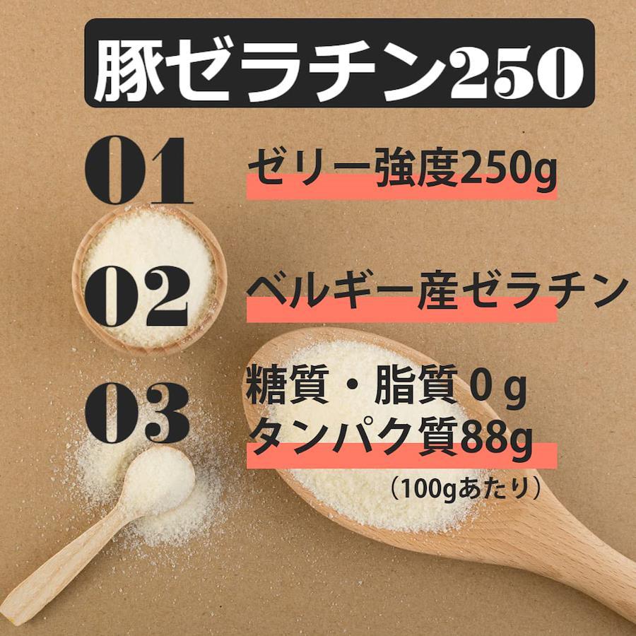【内容量】1Kg【特徴①】ヨーロッパ産の高ブルームゼラチン 。パウダータイプのゼラチンです。ゼラチンはブルームが高くなるほどゼラチン特有の臭いや色が改善され品質が良くなります。【特徴②】グミなどゼラチン使用量が多い菓子や和食など繊細な味付けが要求される時におすすめの高級ゼラチンです。【アレルゲン】ゼラチン【注意点】*パウダータイプのゼラチンですのでダマにならないようあらかじめ砂糖などと混ぜ合わせてからご利用ください。*生果汁では果汁中のタンパク分解酵素によってゼラチンが分解されうまく固まらないことがございます。生果汁を利用の際は果汁を煮沸し酵素を失活させてからゼラチンを加えてください。