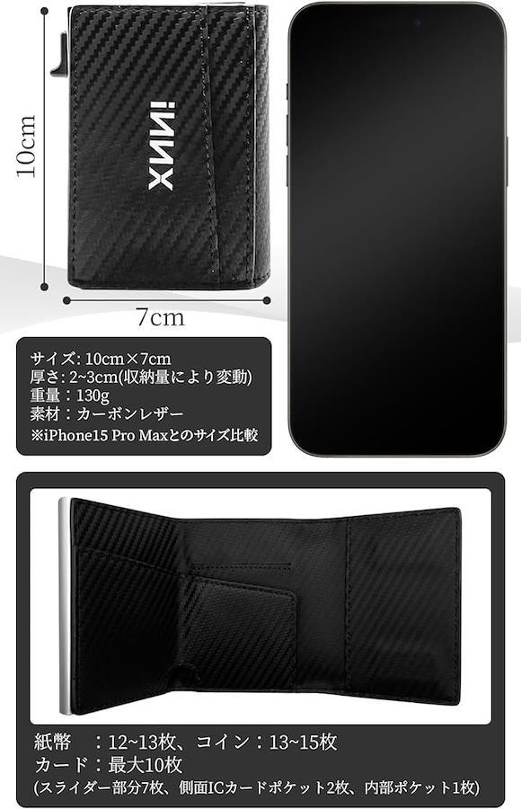 商品仕様:サイズ 10cmx7cmx2~3cm, 容量 紙幣12~13枚 コイン13~15枚 カード最大10枚(スライダー部分7枚,側面ICカード2枚,内部IDカード)
