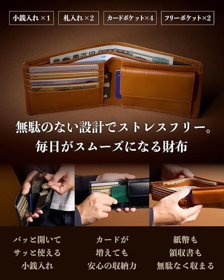 「商品詳細」*仕様:小銭入れx1、札入れx2、カードポケットx4、フリーポケットx2 *サイズ:約11.5cmx約9.6cmx約2cm *カラーバリエーション:キャメル、ブラック、ネイビー、グリーン、ダークブラウン *用途:財布、カードケース、カード入れ、カードホルダー、小銭入れ、札入れ *ブランド名:LEAGOO