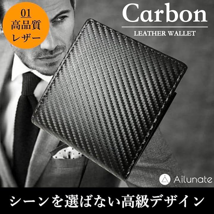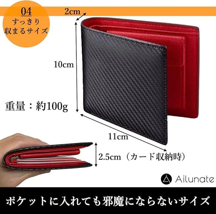 「商品仕様」*サイズ(折りたたみ時):11cmx10cm x 厚さ2cm *重量:約100g *仕様:カードポケットx4、お札入れx2、フリーポケット x 2、小銭入れx1 *カラー:カーボンブラックxレッド / カーボンブラックxブラック / カーボンブラックxブルー *同梱内容:財布 *ブランド:日本ブランド「Ailunate」