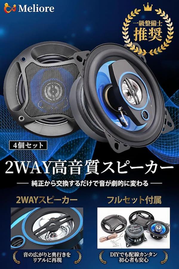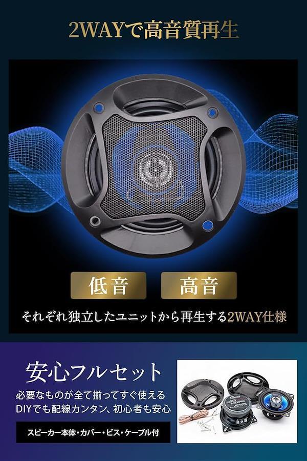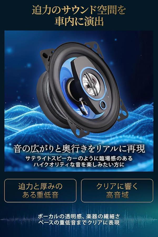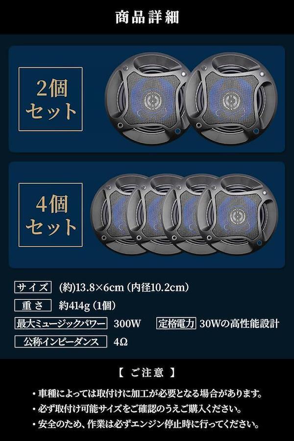 「コンパクトながら本格派」サイズ:(約)13.8x6cm(内径10.2cm)、重さ:1つあたり414g / バリエーション:2個セットor4個セット / 最大ミュージックパワー:300W / 定格電力:30Wの高性能設計 / 公称インピーダンス4Ωで、安定した高音質を実現し他ので、車内でも十分に響くパワフルな音をお楽しみいただけます。