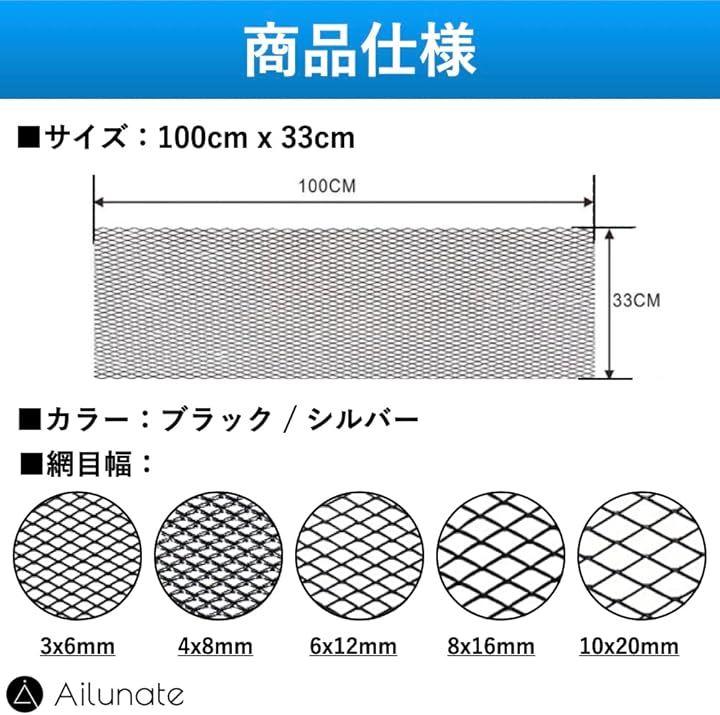 カラーはブラックとシルバーから選択でき、網目の大きさは3mm x 6mm / 4mm x 8mm / 6mm x 12mm / 8mm x 16mm / 10mm x 20mmの5パターンからお選び頂けます。