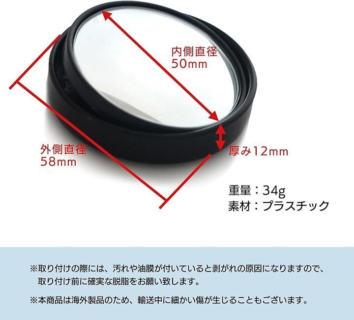 「サイズ」 本体長:58mm 厚み:12mm ミラー部分直径:50mm 重量:34g 素材:プラスチック製 球型ミラーのため、映る範囲が広がりますが、小さく見えることがございます。
