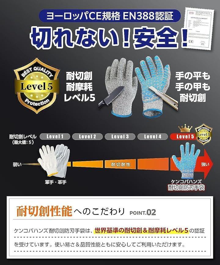 特徴: 超高強度ポリエチレン糸 で編まれ レザー より4倍強いとされている 耐切創手袋 に、 滑り止め をプラスした仕様の 防刃手袋 です。