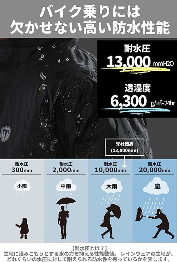 ・v「大雨にも耐えられる高い防水性」耐水圧13,000mmと高い防水性能となっており、雨の中でのバイクや自転車を運転することを想定した高い機能を備えています。