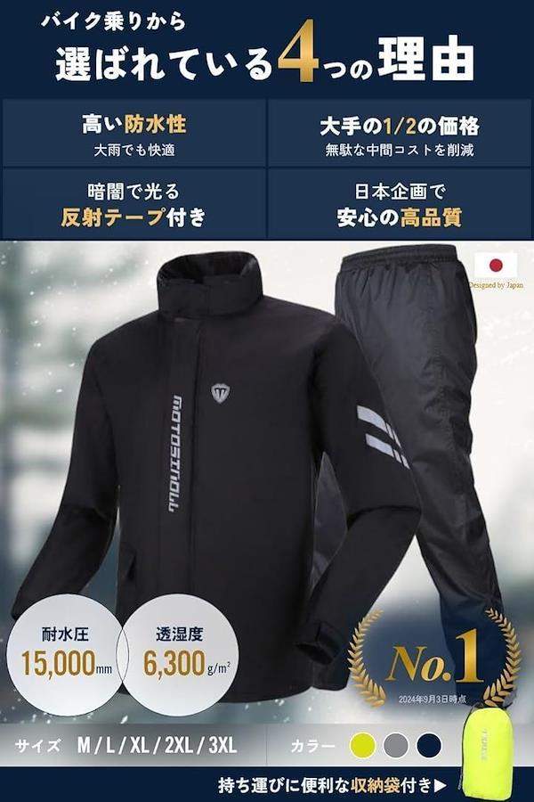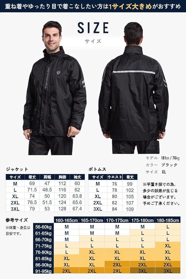「利用シーン」バイク、サイクリング、子供の送迎、登山、釣り、アウトドア、キャンプ、スポーツ、防災など 「機能」*防水(耐水圧13,000mm)、防風、防寒 「カラー」ブラック、グレー、イエロー 「重量」ジャケット約350g、パンツ約300g 「メイン素材」ポリエステル 「サイズ」M~3XL <ジャケット> 着丈 /肩幅/胸囲 /袖丈 [M] : 69 / 47 / 112 / 60.2 [L] : 71.5 / 48.5/ 116 / 62 [XL] :74 / 50 / 120 / 63.8 [2XL] :76.5 / 51.5 / 124 / 65.6 [3XL] :795 / 53 / 128 / 67.4 <パンツ> ウエスト /着丈 [M] : 80 / 99 [L] : 84 / 102 [XL] :88 / 105 [2XL] :92 / 107 [3XL] :96 / 109