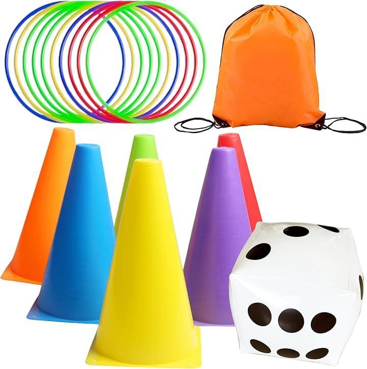 「特大30cmサイコロ入り・充実の20点セット」輪投げ用カラーコーン:高さ23cm(6個・赤色、オレンジ色、青色、緑色、黄色、紫色)、輪投げ用リング:内径16cm、太さ0.6cm(12本・色はランダムです)、サイコロ:30cm x 30cm x30cm(1個)、リュック型収納袋(水色・1個)