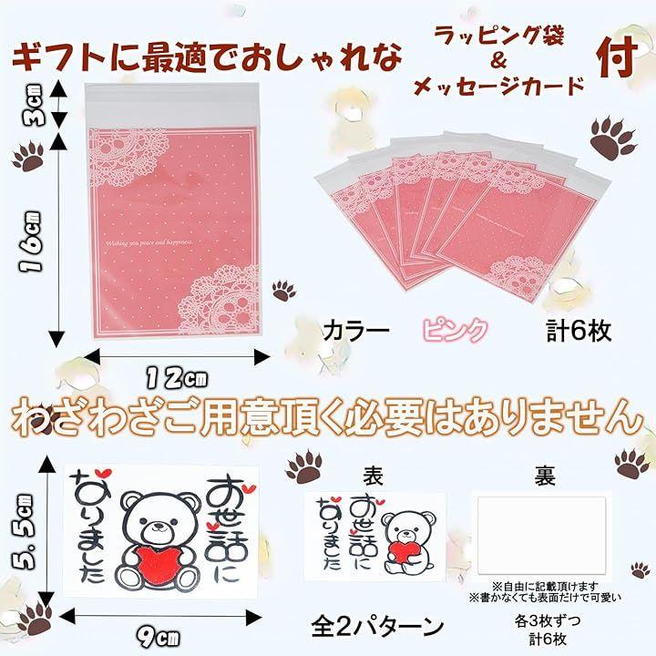 「内容量」 ・Bearタオル 6色x2 計12個 サイズ13cmx10cm 素材 ポリエステル ・ラッピング袋 1色x12 計12枚 サイズ16cmx12cm ・メッセージカード 2種x6 計12枚 サイズ9cmx5.5cm 「梱包サイズ」 幅31cmx奥行23cmx高さ5cm 「総重量」 全体重さ360g