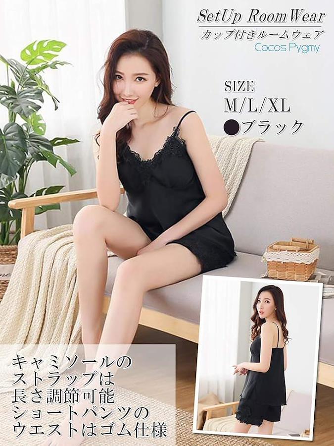 カップ付きのキャミソールとショートパンツの2点セットのリラックスレディースルームウェアです。