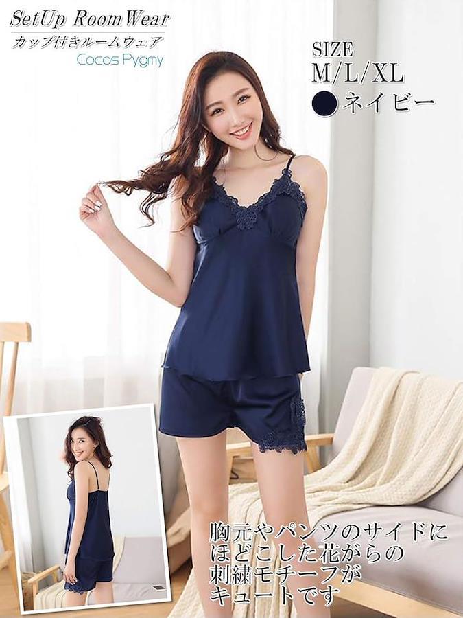 カップ付きのキャミソールとショートパンツの2点セットのリラックスレディースルームウェアです。