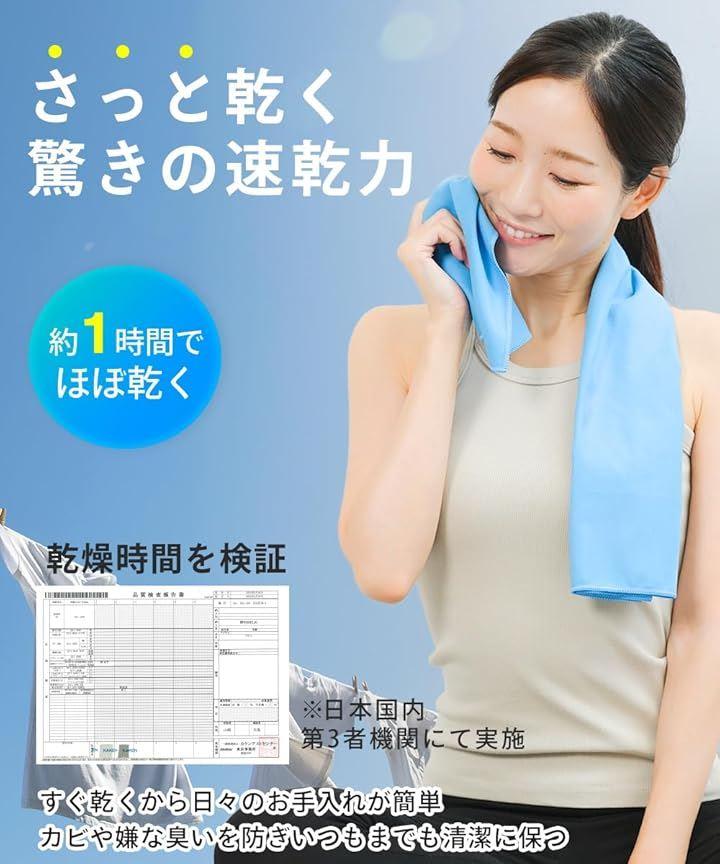 「さっと乾く 驚きの速乾性」 通気性が高くすぐに乾くスポーツタオル。