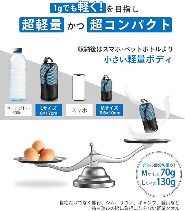 「1gでも軽く超軽量かつ超コンパクト」 Mサイズは約70g、Lサイズは約130gと卵2~3個分の重さ自宅だけでなく、旅行、ジム、サウナ、キャンプ、登山など持ち運びに負担にならない軽量タオルを実現しました。