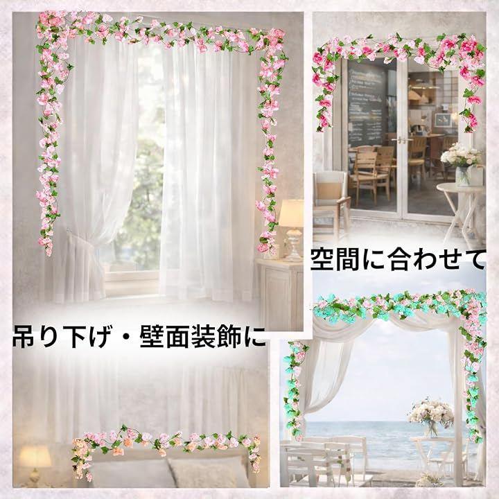 壁面装飾や窓枠、カーテンレール、アーチ装飾など幅広いシーンに対応し、インテリアとしても店舗ディスプレイとしても取り入れやすい造花アイテムです。