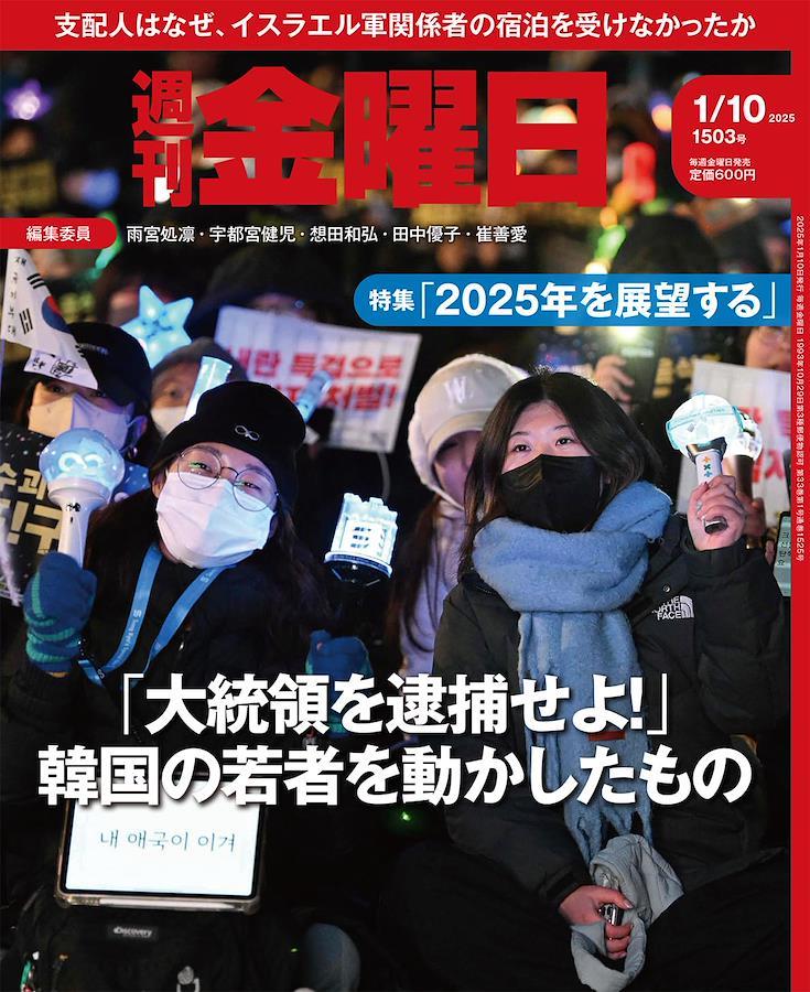 内容■表紙■それでもそれでもそれでも 齋藤陽道■風速計 「2025年の風景」 田中優子■金曜アンテナ・NHK、「かんぽ不正」番組、経営委議事録を公表で和解 原告側、「訴訟は完勝」と評価 臺宏士・防衛省が辺野古基地埋め立てで奄美の土砂採取地調査 沖縄戦遺族からの批判回避か 平野次郎■さらん日記■【特集】2025年を展望する・凱風快晴ときどき曇り 「民主主義の成熟度」 内田樹・国際情勢 四つの危機で最も不安定な局面に 先川信一郎・経済 トランプと国内インフレが金融政策を振り回す 後藤逸郎・環境〈原発・エネルギー〉 際立つ原発回帰の姿勢と偽りの「気候変動対策」 満田夏花・日本と世界の主なスケジュール 先川信一郎・文化〈生成AIと音楽〉 脱身体化の流れ加速するか 松村 洋■政治時評 長谷川綾■韓国・尹大統領への訴追始まる 若者をも巻き込む弾劾デモ 支える国際市民連帯の意味 李泳采■半田滋の新・安全保障論 「米軍の意向」を優先した「動かぬ」オスプレイの結末■イスラエル軍関係者の「宿泊拒否」をめぐって解雇された元支配人が、ホテル運営会社を提訴 「私は、自分の知識を無視したり、責任を放棄したりはできない」 文/中村一成、写真/中山和弘■松崎菊也 あの人の独り言(イラストレーション/石倉ちょっき)■【提携連載企画】保身の代償 長崎高2いじめ自殺と大人たち 第1部・共同通信編 長崎新聞社から共同通信社への「見解文書」入手1 「私怨」を動機とする「悪意に満ちた本」と断定 Tansa・中川七海■不謹慎な旅 「定点」から 雲仙・普賢岳の火砕流災害 写真・文/木村 聡■昨年の診療報酬改定で生活習慣病患者の医療費に大きな変化 内藤眞弓■青木理の温泉という悦楽 信州・野沢温泉の「外湯巡り」■尾池和夫の見る 食べる 学ぶ 急流の河川と出汁の文化 軟水が生み出す和食のうま味■『侍タイムスリッパー』安田淳一監督が斬る日本の農政 主食の生産守れなくて何が食料安保だ 聞き手・まとめ/後藤逸郎■金曜ジャーナリズム塾[第6期 第3講] 政府が発表する情報や表現を鵜呑みにしない 講師・明真南斗■名張事件の映画『いもうとの時間』 阿武野勝彦プロデューサーに聞く 権力の時間軸に抗う歴代制作者たちの執念 ワタナベ=アキラ■きんようぶんか 本・映画・音楽・美術・TVドキュメンタリー■言葉の広場、金曜川柳、イラストレーション、写真展、論考■犬が王様を見て、何が悪い? 四方田犬彦■編集委員から■読者会から■市民運動から講演・映画・音楽イベントの情報案内板■金曜日から、編集長後記 編集部員を募集します■「金曜日」からのお知らせ