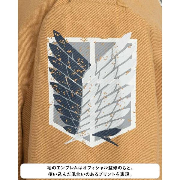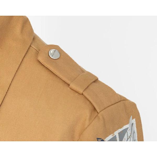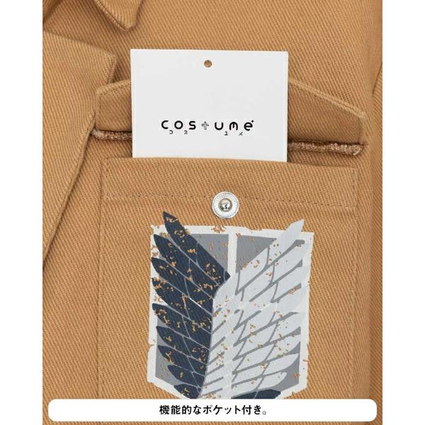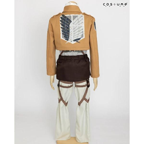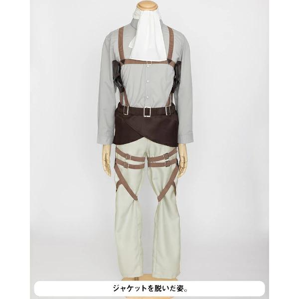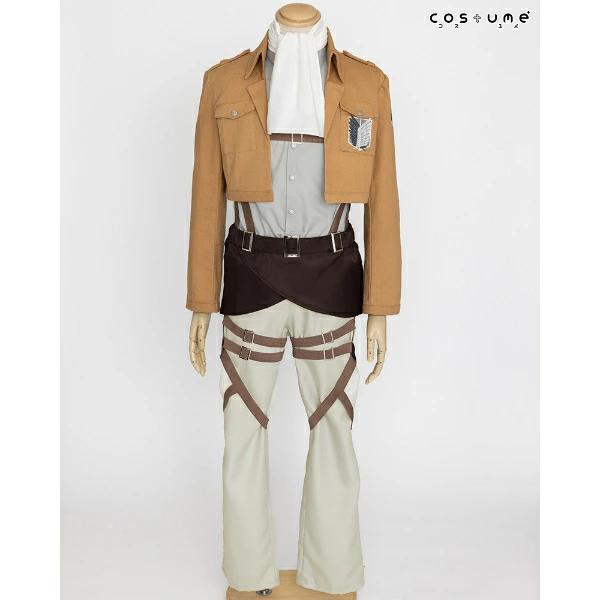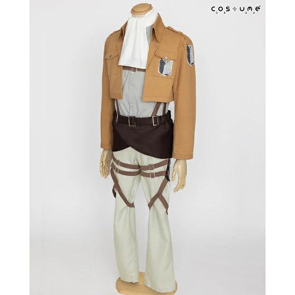 TVアニメ『進撃の巨人』のリヴァイが着ている“調査兵団”のコスチュームセットです!ブーツカバーはお手持ちの靴にかぶせてご使用いただく仕様です。ハロウィン、学園祭、新年会、忘年会様々なシーンで活躍間違いなし!?ハロウィン、学園祭、新年会、忘年会様々なシーンで活躍間違いなし!?【セット内容:ジャケット、リヴァイのシャツ、リヴァイのスカーフ、腰布、固定ベルト付きパンツ、ブーツカバー】【サイズ目安:身長:172~180 チェスト:94~104 ウエスト:80~88 ヒップ:92~98(cm)仕上がり寸法…ジャケット着丈:約43 パンツ脇丈:約103(cm) 】※ウィッグ、靴はセットに含まれません。プリント面にはアイロンをあてないでください。汚れた場合は、取り扱い絵表示に従い、洗濯してください。○濡れたままの放置や、漂白剤及び漂白剤入りの洗剤を使用すると、変色する場合がございますので避けてください。色落ちや色移りする場合がございますので、他の製品とは分けて洗濯してください。水濡れや着用時の摩擦などにより、色落ちや色移りする可能性がありますので、十分ご注意ください。強く引っ張ったりこすったりすると、縫い目がほつれたりプリント部分が割れる場合がありますので、避けてください。高温多湿な場所での保管は合皮の劣化を早めたり、色移りの原因になります。通気性がよく、湿気のない、直射日光を避けた場所での保管をお願い致します。本商品は仮装用の衣装です。着用時の運動は事故の原因になりますので、ご注意ください。また、装着時は転倒、衝撃などによる事故に十分ご注意ください。パッケージの写真・イラストと商品は若干異なる場合がございますので、ご了承ください。