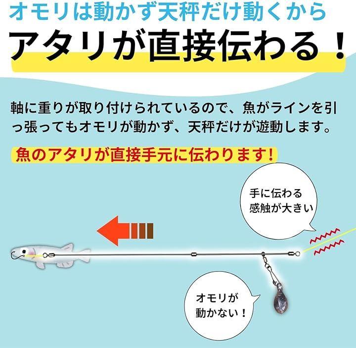 遊動天秤は、軸におもりが取り付けられており、魚がラインを引っ張ってもおもりが動かず、天秤だけが遊動します。
