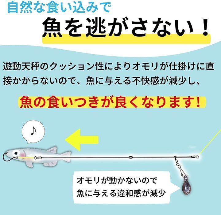 遊動天秤のクッション性によりオモリが仕掛けに直接かからず、魚に与える不快感が減少し、魚の食いつきが良くなります。