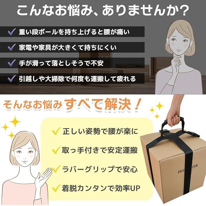 辛い運搬作業を、スマートに変える運搬ベルト」底が抜けそうな重い段ボール、手がかからず滑りやすい家電など、「持ちにくい」荷物の運搬に悩んでいませんか?この運搬ベルトは、あらゆる荷物に後付けで強力なハンドルを作り出し、一人でも、二人でも、安全かつ効率的に荷物を運ぶためのパワフルなアシストツールです。