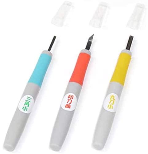 ゴムハン彫刻刀 3本組 Sサイズ 印刀(曲)4.5mm、丸刀(小)3mm、三角刀(小)1.5mm、二層鋼製、安全キャップ付 柄:エラストマー樹脂 30mm角のゴムハンや細かい彫りに適しています。 軸長さ:約126mm 太さ:約φ15mm