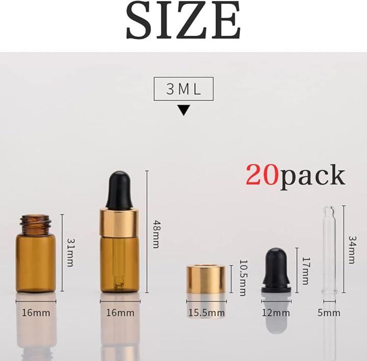 「商品内容」スポイト遮光瓶:20本 容量:3ml カラー:ブラウン <サイズ> 全長:48mm(瓶高:31mm、キャップ部分:17mm) ボトル直径:16mm 重量:6.7g / 個 材質:ガラス、シリコンゴム、PP *仕入れ状況や製造工場の都合により、一部仕様変更がある場合がございます。