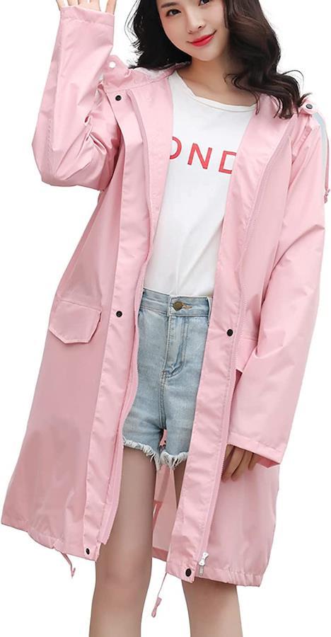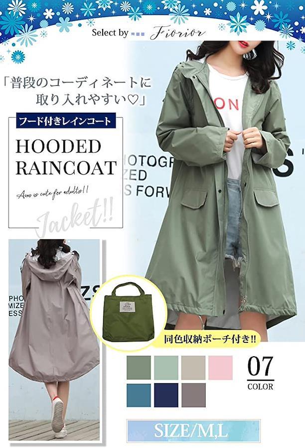 普段のコーディネートに馴染むシンプルでかわいいフード付きレインコートです。