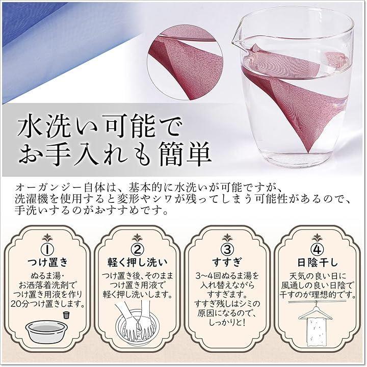オーガンジー自体は、基本的に水洗いが可能ですが、洗濯機を使用すると生地の変形や強いシワが残ってしまう可能性があるので、手洗いするのがおすすめです。