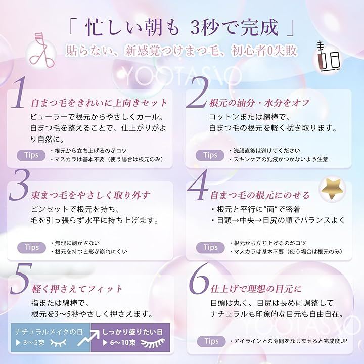 YOOTASIO すぐに使える グルーなしシリーズ 接着剤不要 落ちにくい --- 使用方法: (1) まつ毛の中央部分を軽く挟み、接着部分には触れずに取り外します。