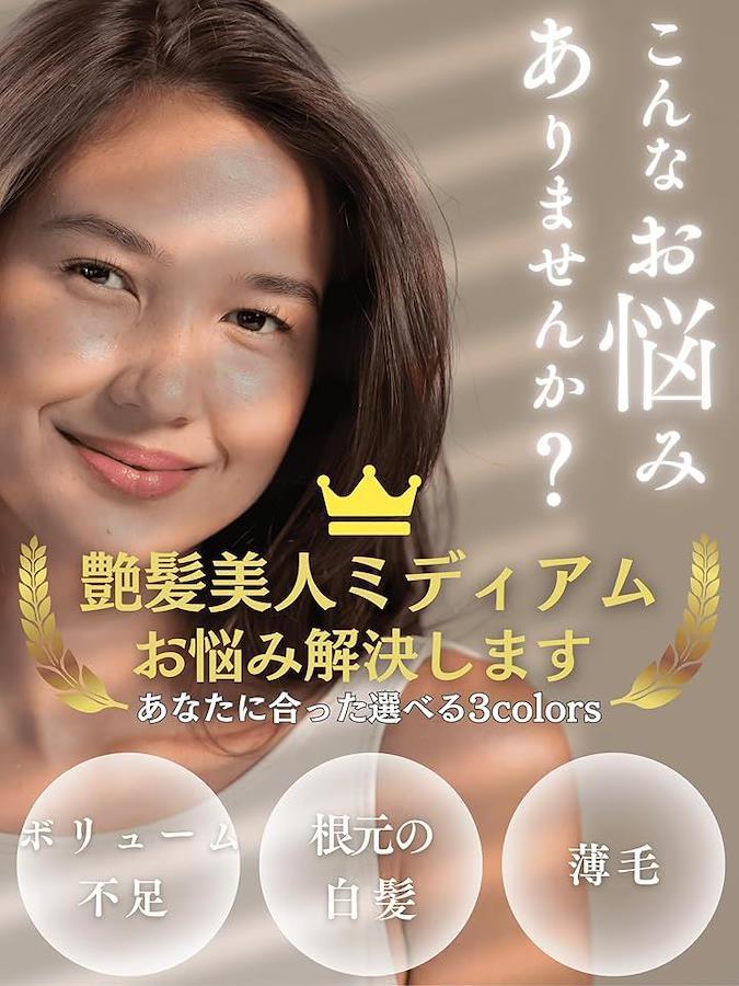 「極自然なI型つむじ」(2)特徴:「艶髪美人ミディアム」はつむじや頭頂部周りの薄毛や生え際の白髪にお悩みの、ウィッグ、付け毛、カツラ初心者に最適の商品。