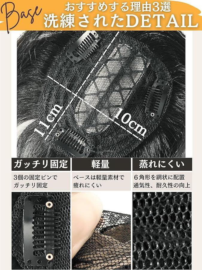 「空気透過性UP」(8)ベース: 強力固定ピンは3つで、より自然なつけ心地を再現致しました。