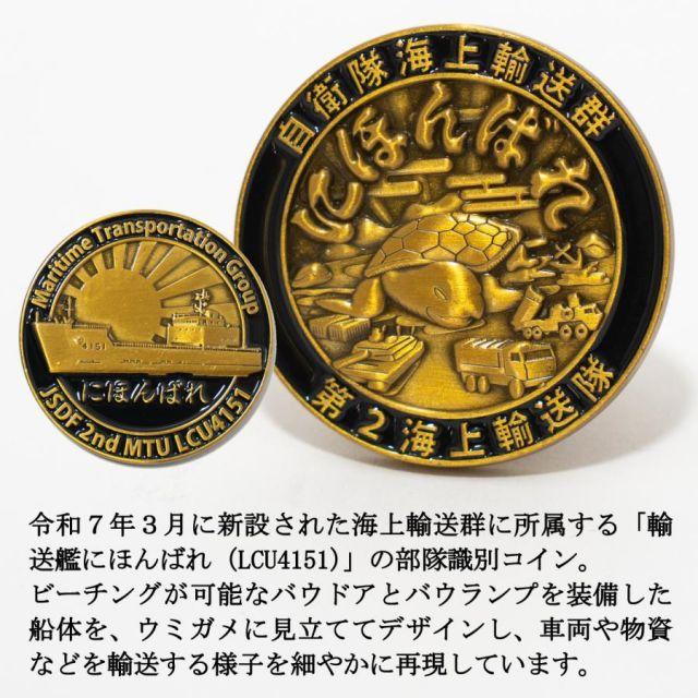 商品名:部隊識別コイン メダル 陸上自衛隊 海上自衛隊 輸送艦にほんばれ チャレンジコイン ゴールド 自衛隊 グッズ コレクション LCU4151令和7年3月に新設された海上輸送群に所属する輸送艦にほんばれ(LCU4151)の部隊識別コインです。ビーチングが可能なバウドアとバウランプを装備した船体を、ウミガメに見立ててデザインし、車両や物資などを輸送する様子を細やかに再現しています。■■■輸送艦にほんばれ■■■令和7年(2025年)4月6日に就役した、にほんばれ型輸送艦の1番艦である新型輸送艦「にほんばれ(LCU-4151)」。陸上自衛官が主体となって運用を行う初めての自衛艦です。艦名は「晴れ渡った空と日本国を想起させるもの」として『にほんばれ』と命名され、「任務の完遂と航海の安全」への願いが込められています。カラー:ゴールドメダル:直径4cm・厚さ4mm商品番号:G2040
