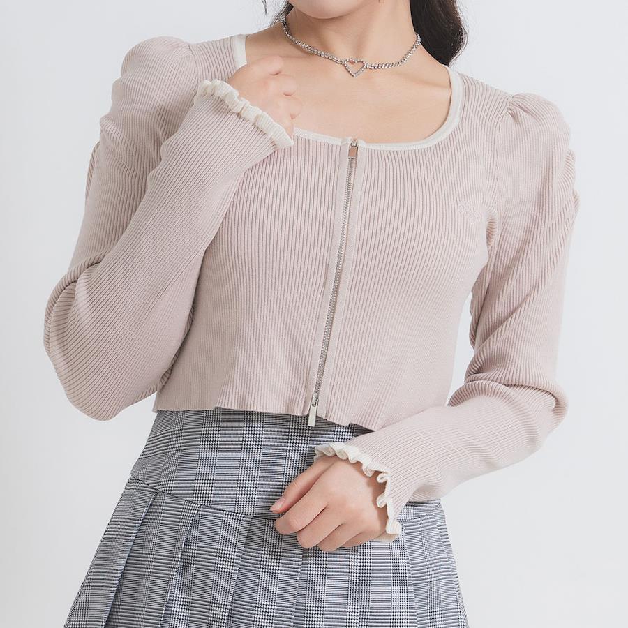 Roseオリジナルロゴ入りダブルジップニットのご紹介。【デザイン】トレンドライクなダブルジップニットが登場!スタイルアップ効果抜群なショート丈でこなれたデザイン◎ジップを閉めてトップスとして着ても、ファスナーを開けてカーデとして着てもOK!配色デザインや、フロントファスナーのシルバーがアクセントに。デコルテが綺麗に見えるスクエアネックで、ネックレスやチョーカーとの相性も◎袖口はちびフリルになっていて、写真に写る手元まで可愛く演出します。新デザインのRoseオリジナルロゴがさりげなく入っており、他とは被らないデザインです!