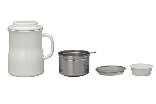 サイズ:約18.5×14×21cm素材・材質:容器・フタ/ホウロウ製、こし網/ステンレス製、カートリッジ(一個)/活性炭入り不織布生産国:日本容量:0.9L(ろ過器が入っている状態の適正容量)※ろ過器の適正容量は0.8L ※2.3L(ろ過器が入っていない状態の満水容量)
