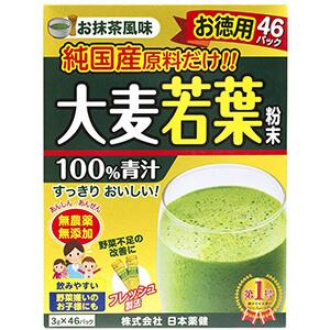■商品概要メーカー:日本薬健商品名:【軽】金の青汁 純国産大麦若葉100%粉末(3g×46パック)区分:食品内容量:3g×46パック商品概要:100%純国産!お徳用サイズJANコード:4573142070034商品コード:078336531■商品の特徴契約農家の手で無農薬栽培された国産の大麦若葉を惜しみなく100%配合!副原料・香料・添加物・防腐剤などは一切無添加!鮮度にこだわり、収穫から24時間内に加工。さらに鮮度を保持するため、「フレッシュパック方式」を採用。お抹茶風味の味でありながら、青汁特有の青臭さがないスッキリとした味。食物繊維、ビタミン、ミネラルなどいろんな栄養素がたっぷり!野菜不足の改善におすすめです。■原材料/成分/素材/材質大麦若葉粉末■栄養成分【1パック(3g)あたり】エネルギー:8.8kcal、たんぱく質:0.9g、脂質:0.2g、糖質:0.2g、食物繊維:1.3g、ナトリウム:0.8mg、飽和脂肪酸:0.0g、トランス脂肪酸:0.0g、コレステロール:0.1mg、β-カロテン:0-1320μg、ビタミンB1:0.01mg、ビタミンB2:0.04mg、ビタミンB6:0.02mg、ビタミンC:1.1mg、ビタミンE:0.2mg、ビタミンK1:81μg、ビオチン:0.7μg、葉酸:16μg、ナイアシン:0.1mg、パントテン酸:0.04mg、カルシウム:12mg、マグネシウム:5mg、カリウム:72mg、リン:12mg、亜鉛:0.1mg、銅:0.03mg、鉄:0.3mg、マンガン:0.08mg、クロム:2μg、アスパラギン酸:56mg、アラニン:38mg、アルギニン:33mg、イソロイシン:26mg、グリシン:32mg、グルタミン酸:68mg、シスチン:8mg、スレオニン:28mg、セリン:25mg、チロシン:18mg、トリプトファン:12mg、バリン:35mg、ヒスチジン:14mg、フェニルアラニン:31mg、プロリン:29mg、メチオニン:12mg、リジン:34mg、ロイシン:49mg、タンニン:18mg、カフェイン(無水):検出せず、SOD様活性:19-930unit、総クロロフィル:25mg、ポリフェノール:21mg、食塩相当量:0.0g■賞味期限/使用期限(製造から)3年■原産国・製造国日本■使用方法/召し上がり方1日1~2パックを目安にお召し上がりください。コップに粉末を先に入れてから水や牛乳を100cc注ぎ、粉末が沈んでから素早くかき混ぜると、キレイに混ぜることができます。■保存方法直射日光および、高温多湿の場所を避けて、保存してください。■メーカー希望小売価格(税込)オープン価格■発売元/製造元/輸入元日本薬健■お問い合わせ先お問い合わせ電話:0800-888-0070受付時間:月~金9時30分~17時(土日祝を除く)