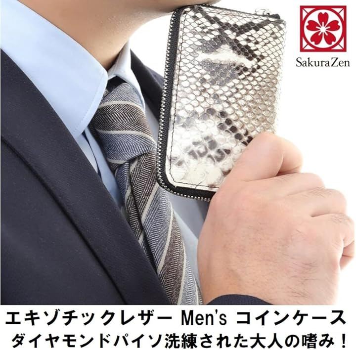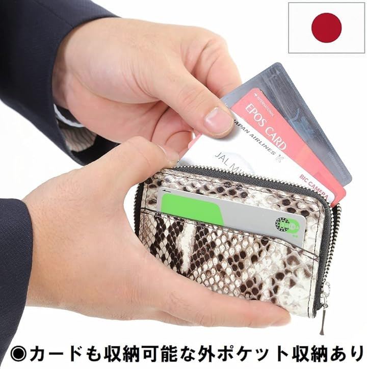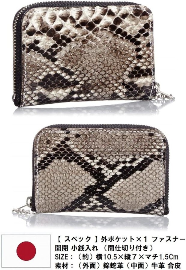 「 スペック」外ポケットx1・ファスナー開閉小銭入れ(間仕切り付き)、SIZE:(約)横10.5x縦7xマチ1.5cm、素材:(外面)錦蛇革(中面)牛革 合皮、原産国:日本製(ハンドメイド品)、コンパクト財布メンズ・ レディース 「ご注意」天然蛇革皮革(エキゾチックレザー)の為、一つ一つの鱗(ウロコ)模様などが画像とは若干異なります。