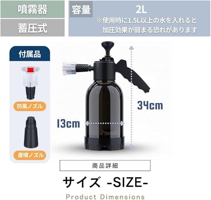 サイズ(約):全長34cm、幅13cm 容量:2L(使用時に1.5L以上の水を入れると、加圧が弱まる恐れがあります) *サイズ詳細は商品画像をご確認ください。
