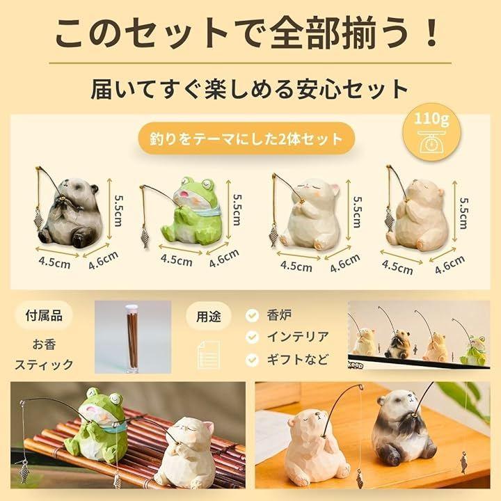 「商品仕様」4.6x4.5x5.5cm、110g、カエル・パンダ2体セット、付属品:お香、スティック