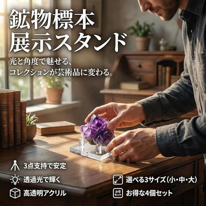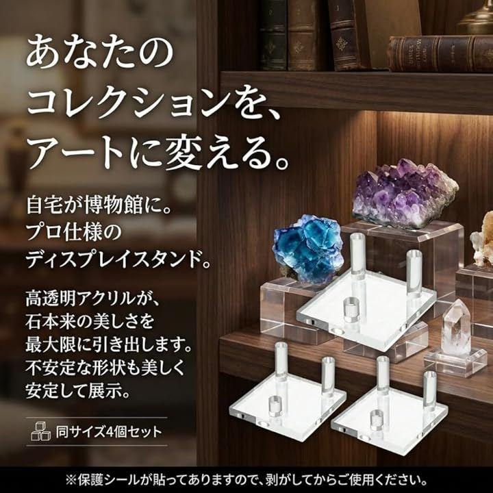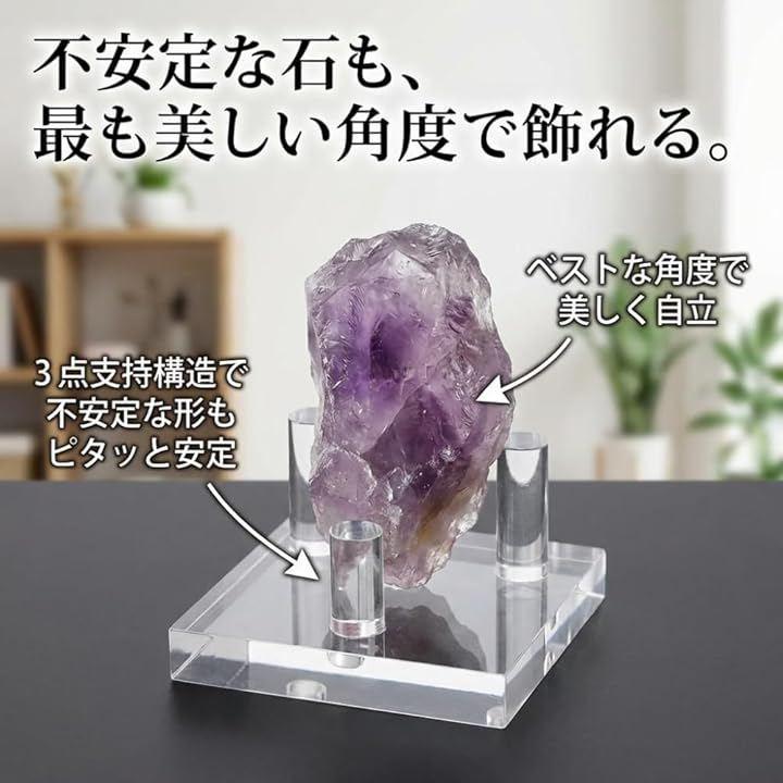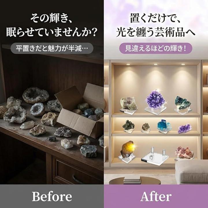 このアクリルスタンドに乗せるだけでそれらは「単なる石」から光を纏う「芸術品」へと生まれ変わります。