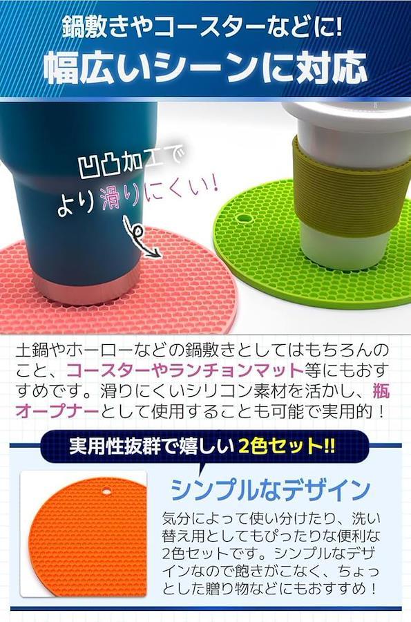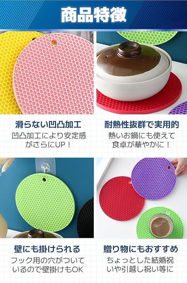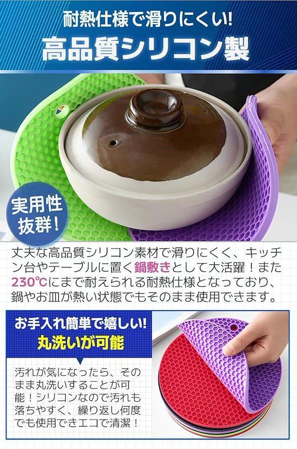 「高品質シリコン製」丈夫な高品質シリコン素材で滑りにくく、キッチン台やテーブルに置く鍋敷きとして大活躍。また230℃にまで耐えられる耐熱仕様となっており、鍋やお皿が熱い状態でもそのまま使用できます。