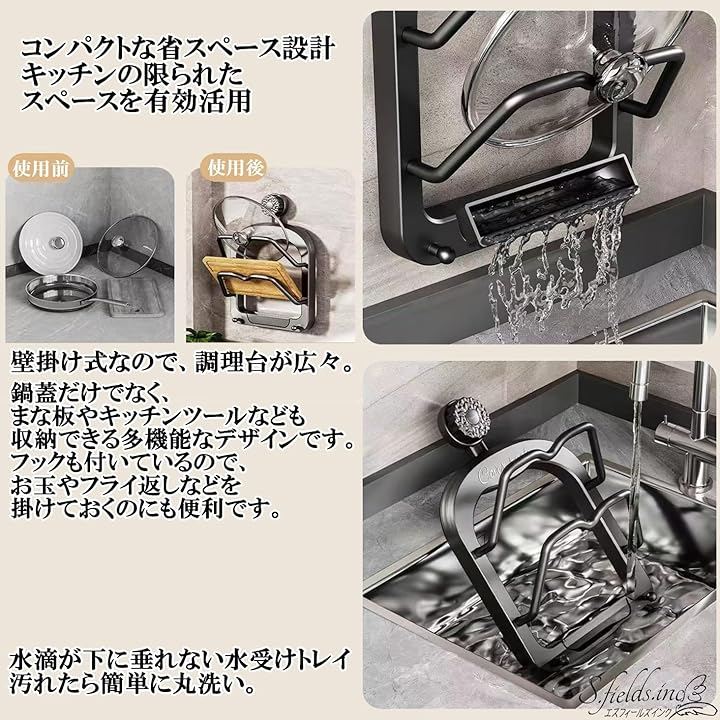鍋蓋だけでなく、まな板やキッチンツールなども収納できる多機能なデザインです。