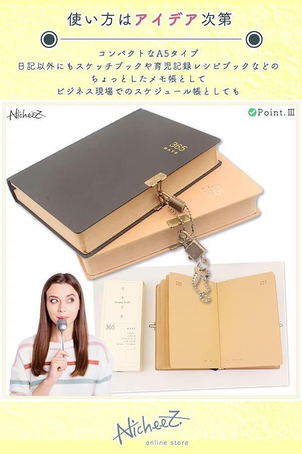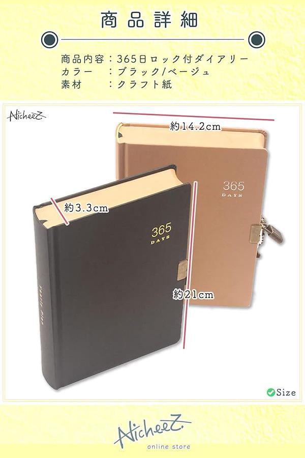 「商品内容」365日ロック付ダイアリー セット数:1冊 カラー:ブラック 素材:クラフト紙 サイズ:縦/約21cm 横/約14.2cm 厚さ/約3.3cm 枚数/192枚(384ページ)