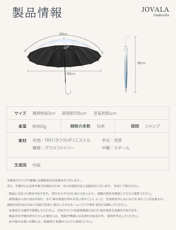 重さ約450g 本骨数:16本骨 /サイズ:全長≈85cm、親骨≈60cm、開いた時の直径≈105cm
