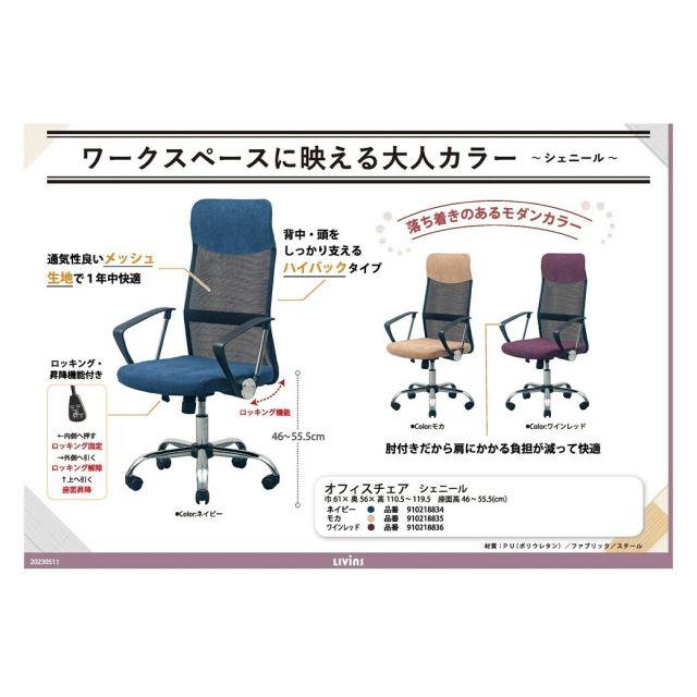 ワークスペースに映える大人カラーがモダンなハイバックタイプのオフィスチェア。通気性のよいメッシュ生地で、座り心地が良く長時間座っても疲れません。1年中快適にお使い頂けます。ネイビー・モカ・ワインレッドの3色からお選びいただけます。