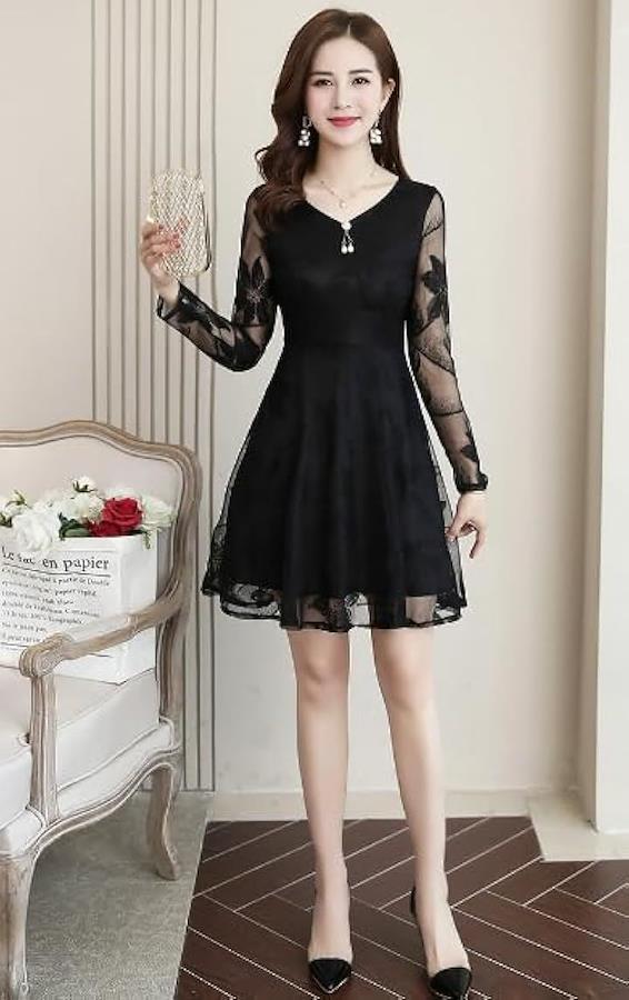 Long sleeve party dress, one piece, see-through, floral print, mini, women's, sheer, female, formal