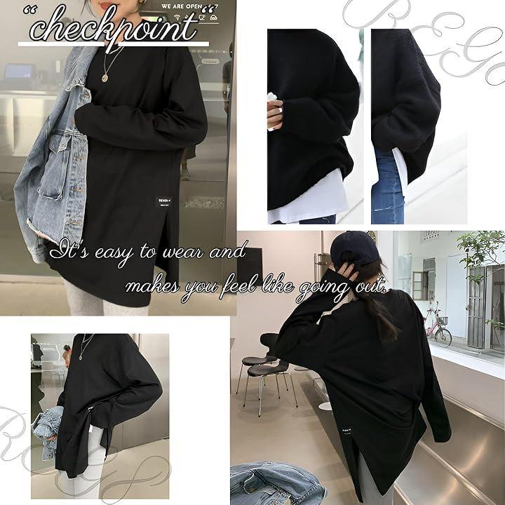 Women's Long Sleeve T-Shirt, Loose Fit, Solid Color, Korean Style, Slit, Oversized Top, Thin, Large, U-Neck, Black, White, Summer, Spring, Autumn