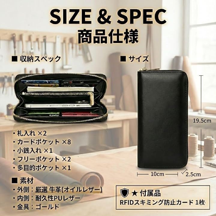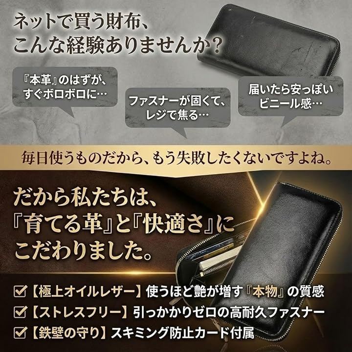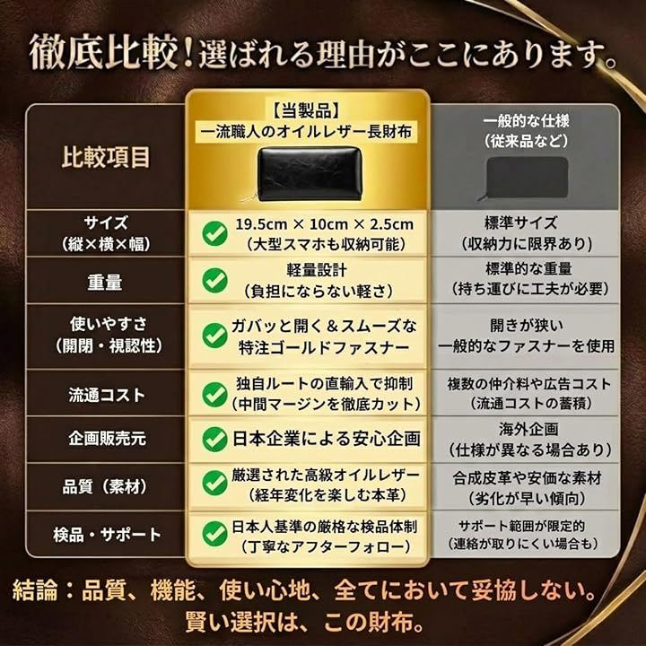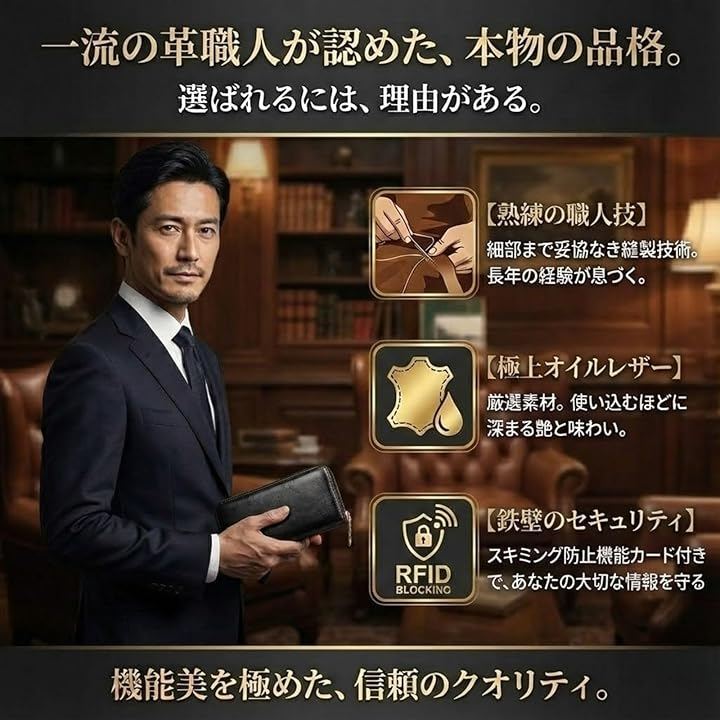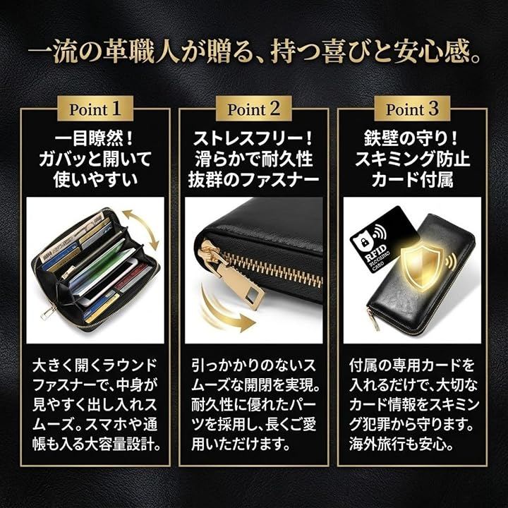 引っかかりのないスムーズな開閉を実現し、漆黒のレザーに映えるゴールドファスナーが、高級感と大人の品格を引き立てます。