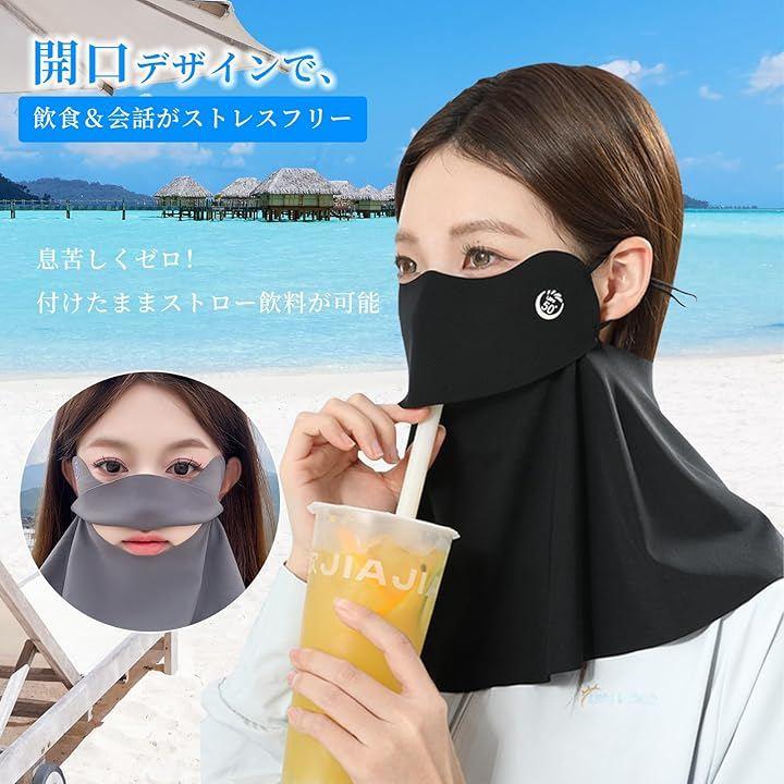 「開口デザイン&飲み物飲める&息苦しくゼロ」開口デザインのUVカットフェイスカバーは上下2段階の開放構造で、吐息が自然に下方へ逃げる設計です。