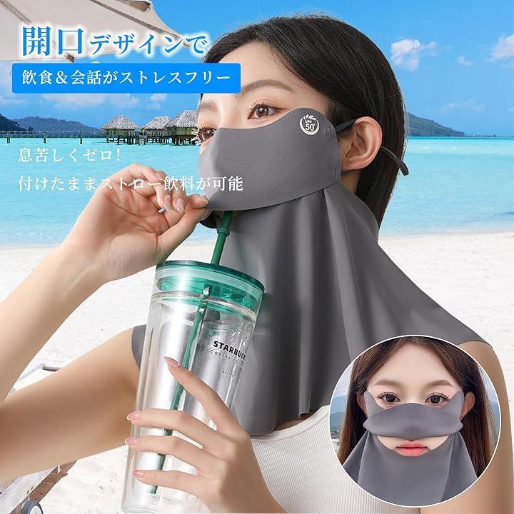 「開口デザイン&飲み物飲める&息苦しくゼロ」開口デザインのUVカットフェイスカバーは上下2段階の開放構造で、吐息が自然に下方へ逃げる設計です。