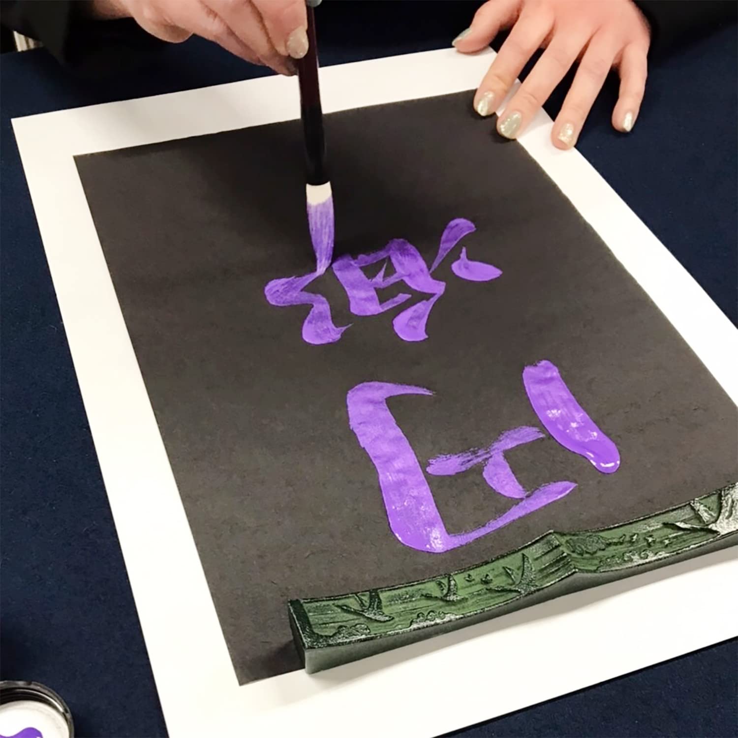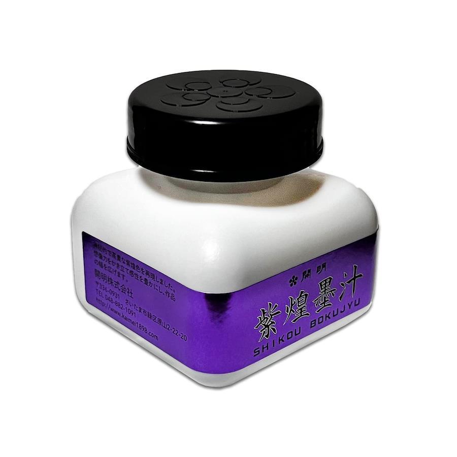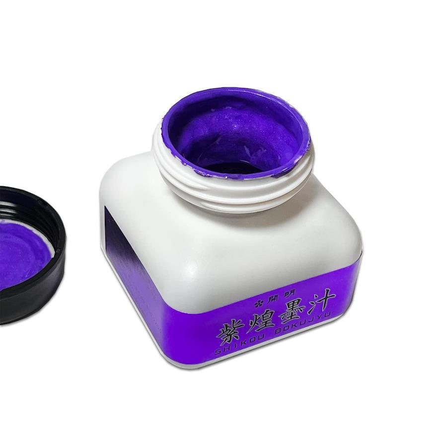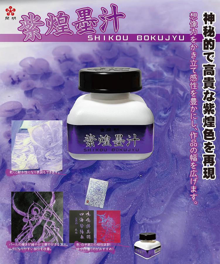 人気の色墨汁シリーズの紫色です。特殊配合の顔料を用いて、墨汁の製法で開発した画期的な製品です。神秘的で高貴な紫煌色を再現。想像力をかき立て感性を豊かにし、作品の幅を広げます。パールの輝きが細やかで華やかさを演出。また墨と混ぜると幻想的な世界が広がり作品の幅を広げます。色半紙との相性も抜群。墨汁の製法によりなめらかな書き味を実現しました。写経や、書画作品制作にご使用しただけます。ムラになりやすい部分を改善し、乾くと耐水性になり裏打ち、表装可能です。色・白半紙との相性抜群!ゆっくり書くのがおすすめ!